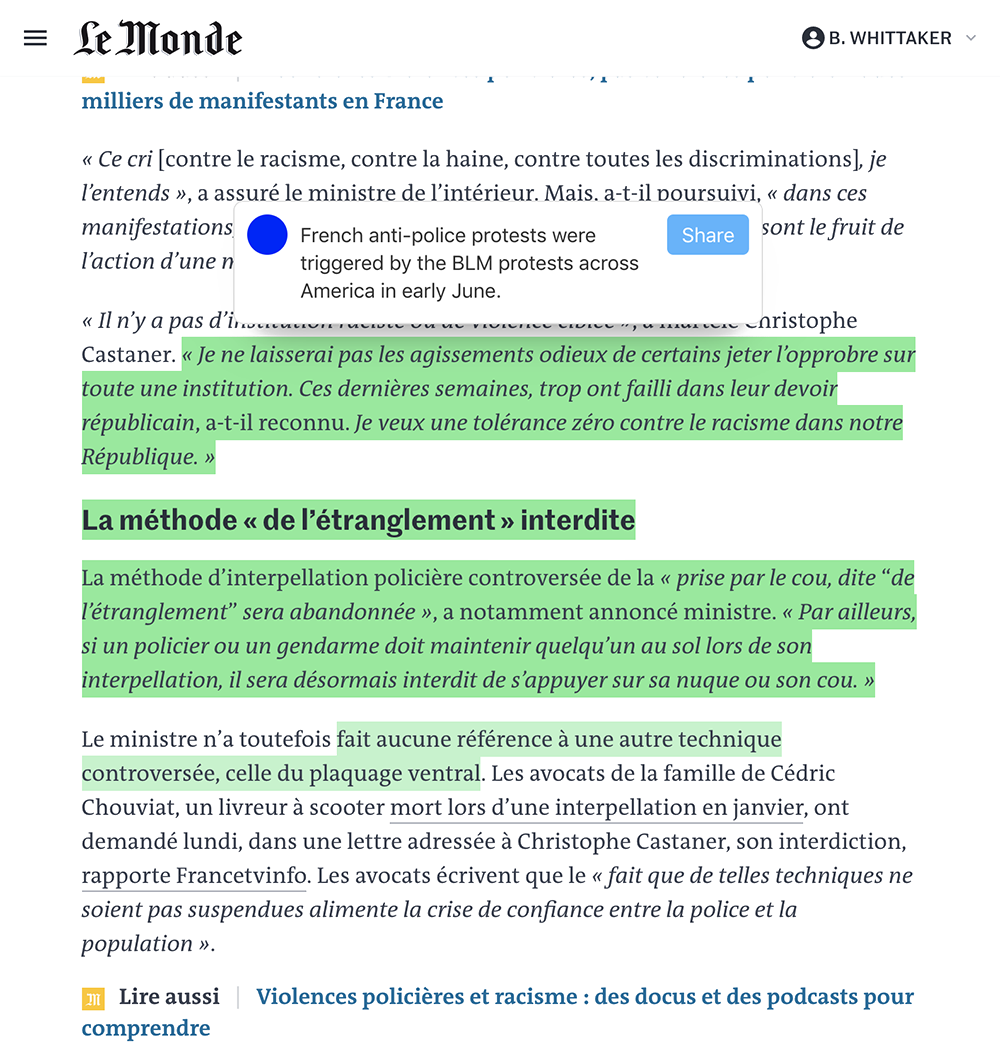 Think Pocket meets Medium, with a social flair. Done as a commission, this project was an exercise in making no assumptions. The core issue of saving and retrieving highlights across the web starts with JavaScript Range selections, and it only gets worse. Don't count on the text remaining constant, the document remaining constant, the path remaining constant, the content existing at page load, or not being dynamically destroyed and recreated. Don't count on the CSS cooperating, the page JavaScript not overriding shortcuts or actions. Don't count on anything.